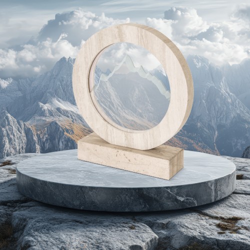 RDT3210016Trophée en forme de montagne, réalisé en élégant marbre travertin et en verre.