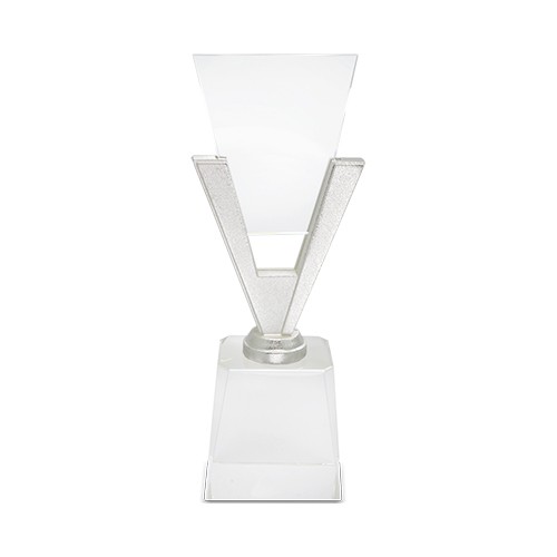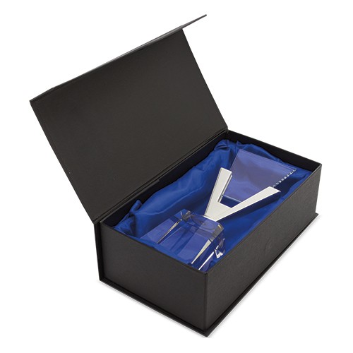RDT3017396Trophée en verre, avec base prismatique, insert en forme de V et plaque de verre appliquée. Livré dans un coffret à l'intérieur rembourré et doublé de satin bleu, avec fermeture magnétique.