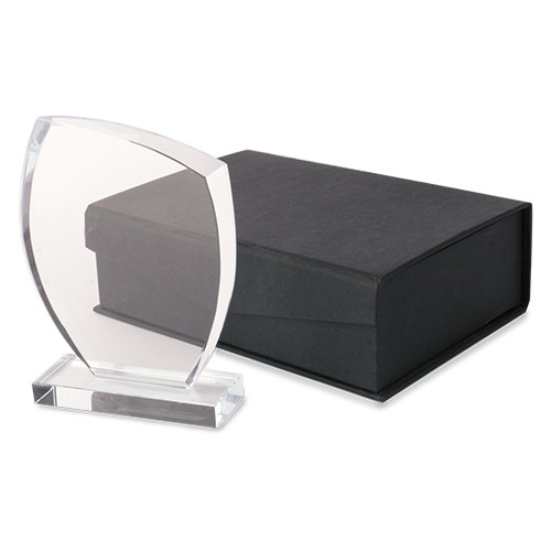 RDT3017277Trophée en verre avec coins biseautés. Emballé avec un intérieur rembourré doublé de satin bleu, avec fermeture magnétique.