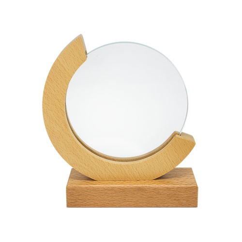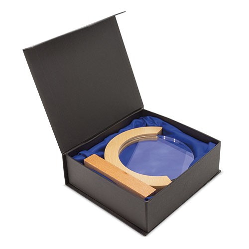 RDT3017769Trophée avec base en bois et plaque de verre reposant sur celle-ci. Livré dans un emballage avec intérieur rembourré et fermeture magnétique.
