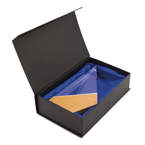 RDT3017754Trophée avec base en bois et partie en verre en forme de voile. Livré dans un emballage avec intérieur rembourré et fermeture magnétique.