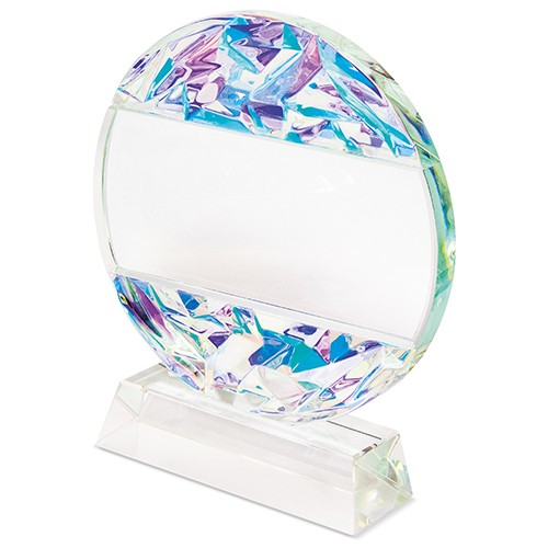 RDT3210018Trophée en verre élégant avec des surfaces facettées qui reflètent différentes couleurs selon l’angle de vue.