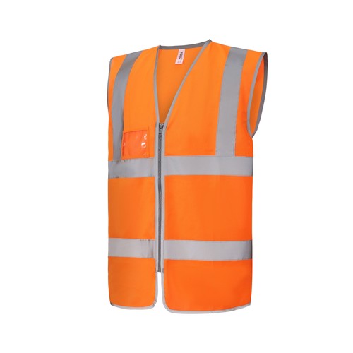 RDT3345249Gilet d'amélioration de la visibilité avec poche porte-badge. Idéal pour un port quotidien au travail. Fabriqué à partir de tissu recyclé. Les bordures réfléchissantes assurent une visibilité optimale. Coutures doubles renforcées autour de la poche porte-badge. Fermeture zippée intégrale assortie pour un maintien sécurisé. Grande surface de marquage. 25 cycles de lavage maximum. Conforme à la norme EN ISO 20471:2013 Classe 2. Le coloris Hi Vis Orange est également conforme à la norme RIS-3279-TOM.