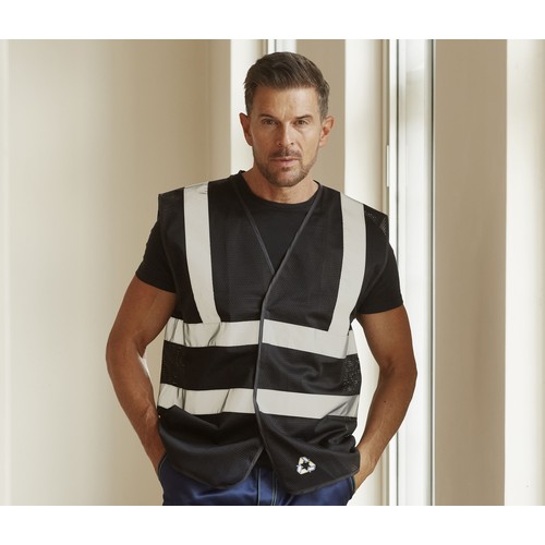RDT3272712Maille filet respirante. Conforme à la spécification EN ISO20471:2013 Class 2. Fermeture par Velcro®. 2 bandes verticales et 2 bandes horizontales réfléchissantes cousues de 5cm.